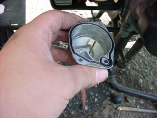 This is the float bowl.. it's like a gas reservoir, so no matter how you ride, the gas won't cut out on you. as you can see, it stores a quantity of gas, which you should probably dump out. this bowl should not have any contaminants in it.. if it does, you may want to replace the fuel filter.